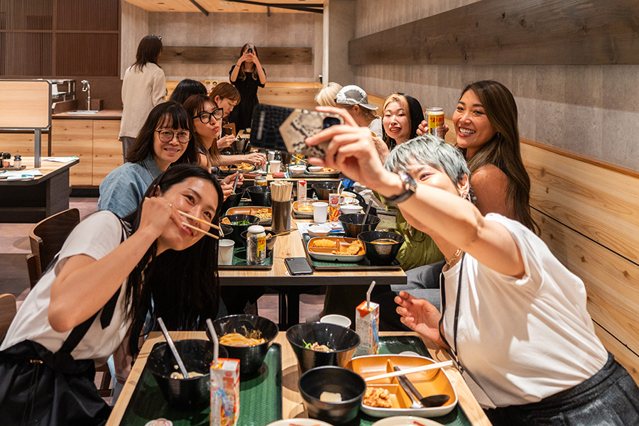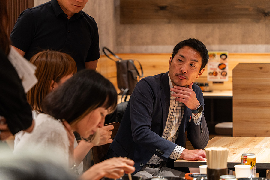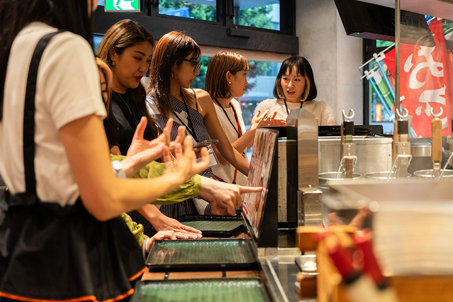 SIW2023でワークショップを行った”はなまるうどん”とコラボレーション。SIW2023での「渋谷から“うどんをアップデート”するワークショップ」におけるディスカッションをへて、多様な分野で活躍するWWAリーダたちがリニューアルした「はなまるうどん八丁堀店」に集まり、新たな内装やメニューを実際に体験しながら企業の代表者たちと意見交換しました。