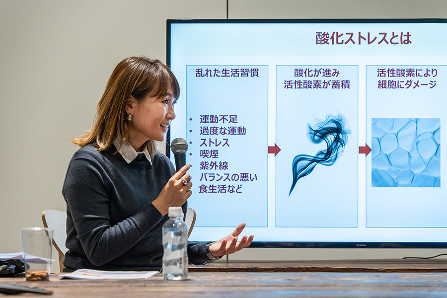 セミナーの冒頭、長田は不規則な生活習慣や食生活、睡眠の乱れから生じる酸化ストレスについて問題提起を行いました。これを受け、まず井上さんは酸素と人体の関係性から説明を始めました。