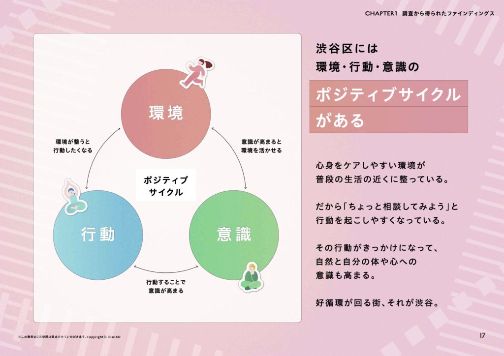 そこで、大広フェムテック・フェムケアラボは、独自生活者調査を行い、生活者のリアルな声や生活実態を踏まえながら、社会に定着し新たな価値を生み出していくためのヒントを探りました。その中でも本調査では、女性活躍をはじめすべての人をエンパワーメントすることに力を入れている渋谷区に着目し、渋谷未来デザイン内「わたしたちのウェルネスアクション」チームとともに分析を行ったところ。環境・行動・意識の3つの側面で「ポジティブサイクル」が回っていることを発見しました。